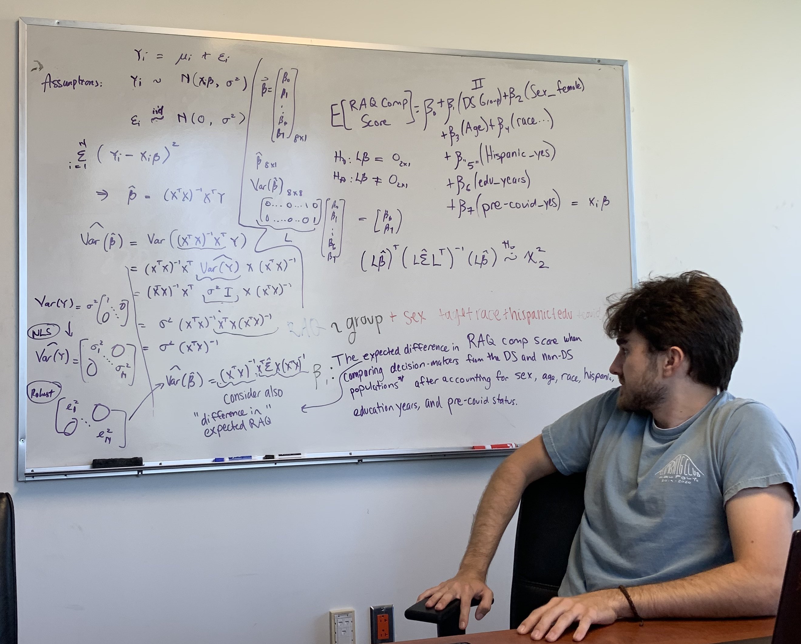 The first of my three classes was on infectious diseases, exploring infectious disease modeling through SIR models, Markov chains, Ordinary Differential Equation (ODE) models, branching processes, and importance sampling. The theory class in the Spring term returned to linear models, where we worked heavily with proofs related to estimability, Best Linear Unbiased Estimators (BLUE)), Gauss-Markov theory, Iteratively Reweighted Least Squares (IRLS), quadratic forms, and asymptotic distributions. The applied class extended and formalized ideas from generalized linear models to correlated data through the usage of Generalized Linear Mixed Models (GLMMs) and Generalized Estimating Equations (GEEs), with a heavy reliance upon estimating equation theory.